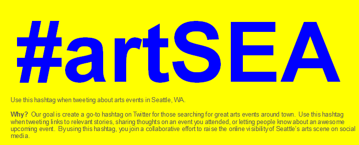 Update: on September 26th at 3pm, #artSEA trended, because of the effort of hundreds of Seattle arts organizations, artists and fans. Join us in keeping #artSEA the hashtag individuals and organizations use to promote and search art events in Seattle! Tweet about an upcoming arts event or review and include #artSEA in your tweet. You can also simply tweet: “Support the Seattle arts community! Use #artSEA when tweeting about current & upcoming arts events! Details: http://bit.ly/OVmLOF ”
